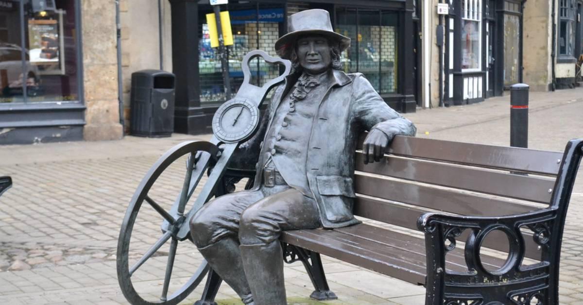 The sculpture of Blind Jack with his trundle wheel in Knaresborough Market Place.