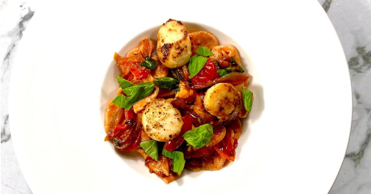 Beetroot pasta in a tomato and pepper sauce